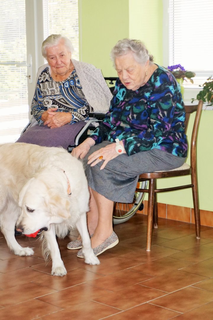 Jinak tomu nebylo ani počátkem února, kdy se uskutečnila další návštěva canisterapeutky Mgr. Evy Martínkové ze spolku Tlapky pro radost, z.s. Paní Martínková se svými čtyřnohými přáteli u nás nebyla poprvé a tato aktivita se vždy setká s úspěchem a zájmem klientů, především těch, kteří se sami dříve o psa starali. Konalo se setkání kolektivní a v úvodu byly představeny hlavní účinkující fenky Dora, Karolína a Sofie. Zájemci si mohli pejsky pohladit a také si vyzkoušet česání a kartáčování psí srsti. Nechybělo krmení pamlsky, které s sebou paní Martínková vždy přiveze. Kromě těchto tradičních aktivit nás canisterapeutka potěšila i nově nacvičenými technikami. Aportem míčku a originálními kousky, při kterých coby překážkovou dráhu pro své čtyřnohé přátele využívá vlastní tělesnou schránku. Společně jsme strávili téměř hodinu a jistě můžeme říci, že se odpoledne velmi vydařilo. Klientům upoutaným na lůžko, kteří měli o canisterapii zájem, jsme zprostředkovali zvířecí návštěvu individuální na jejich pokojích. Každý, kdo se takové návštěvy někdy účastnil, potvrdí, že někteří psi jsou výborní na polohování, často sami nalézají správná místa, kam si mají k člověku lehnout. Spokojené úsměvy seniorů naznačují, že návštěva Tlapek pro radost v našem centru nebyla poslední.