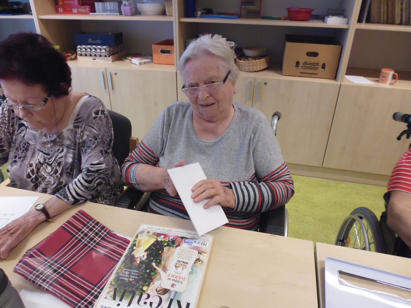 Co jsme si přáli? Kosmetické balíčky, předplatné časopisů, nástěnný kalendář, mobil pro seniory, lupu, polštář, deku, halenku, lampičku, televizi, nánožník do invalidního vozíku, krmení pro ptáčky na celou zimu, kolo štěstí, křeslo, šicí stroj, křížovky, osmisměrky, sudoku, společenské hry pro klienty denního stacionáře - Fronta, Země- město, Mozkovna, Konečně doma, Domino, Quickomino, Puzzle, Speed Cups, Presto presto, atd……..